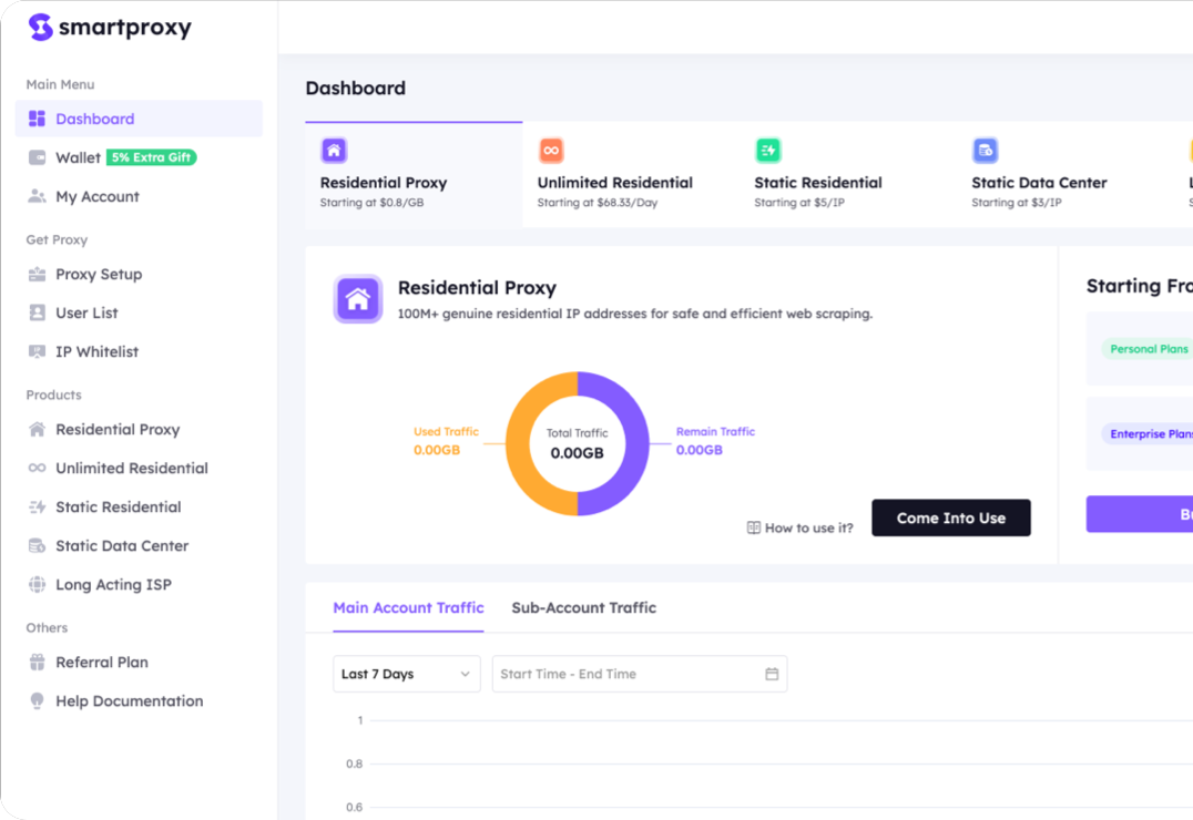 smartProxyはAI・自動化・データ活用業界の日常業務に最適化された、信頼性抜群の住宅用&データセンタープロキシを提供。エンタープライズ級の安定性、リアルタイム分析、直感的なダッシュボードで、あなたのビジネスをもっと速く・賢くスケールアップ!